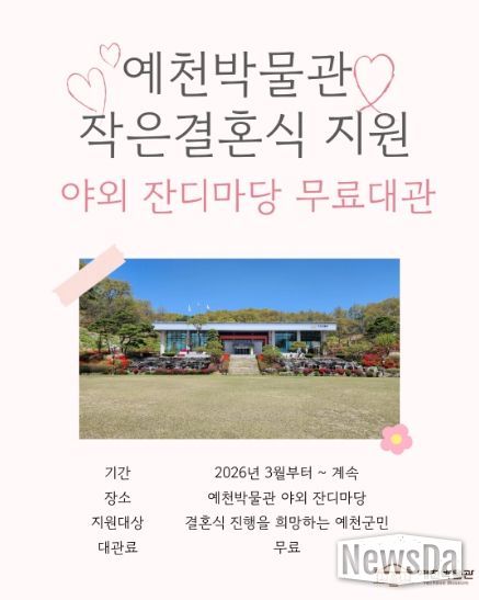 뉴스다 최광묵 기자 | 예천박물관은 오는 3월부터 야외 잔디마당을 ‘작은결혼식’ 장소로 무료 대관한다고 밝혔다.