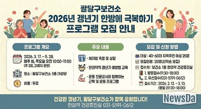 뉴스다 최광묵 기자 | 수원시 팔달구보건소가 ‘2026년 갱년기 한방에 극복하기’ 프로그램에 참여할 40~60대 지역 여성을 3월 13일까지 모집한다.