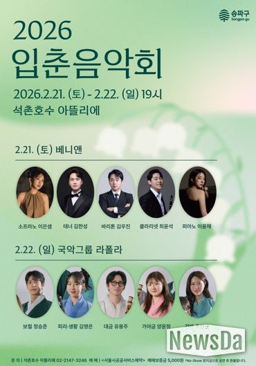 뉴스다 최광묵 기자 | 서울 송파구는 입춘을 맞아 오는 2월 21일과 22일 오후 7시 석촌호수 아뜰리에에서 ‘2026 입춘음악회’를 개최한다고 밝혔다.