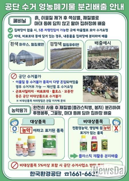 이종원 자원순환과장은 “영농폐기물의 적정 수거는 농촌 환경 관리와 자원순환을 실천하는 데 있어 중요한 역할을 한다”라며 “올바른 분리배출이 현장에서 정착될 수 있도록 지속적으로 안내하고 관리해 나가겠다”라고 밝혔다.