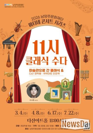 뉴스다 최광묵 기자 | 남양주시는 3월부터 11월까지 다산아트홀에서 남양주문화재단이 기획공연 시리즈 ‘2026 남양주문화재단 마티네 콘서트’를 개최한다고 밝혔다.