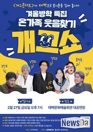 뉴스다 최광묵 기자 | 태백시는 겨울방학을 맞아 오는 2월 27일 오후 7시 태백문화예술회관 대공연장에서 '온가족 웃음찾기 개그쇼'를 개최한다고 밝혔다.