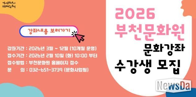 뉴스다 최광묵 기자 | 부천문화원이 2026년 문화강좌 수강생을 모집한다. 올해로 설립 60주년을 맞은 부천문화원은 지역문화의 기틀을 다져온 공공문화예술기관으로, 시민의 일상 속에서 역사·문화·예술의 기반을 넓혀가고 있다.