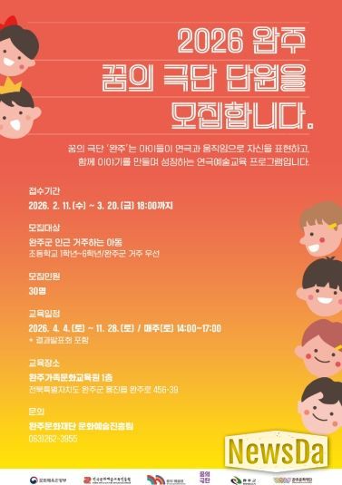 뉴스다 최광묵 기자 | (재)완주문화재단(이사장 유희태)은 완주군, 한국문화예술교육진흥원과 함께 추진하는 '꿈의 무용단 in 완주'와 '꿈의 극단‘완주’'의 2026 단원을 모집한다. 두 프로그램 모두 완주군 및 인근 거주 초등 1~6학년 아동(완주군 거주 우선)을 대상으로 하며, 각 30명(사회적 배려계층 40% 우대)을 선발한다.