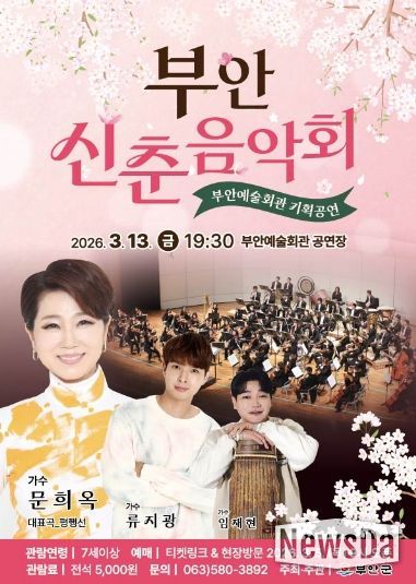 뉴스다 최광묵 기자 | 부안군은 오는 3월 13일 오후 7시 30분 부안예술회관 공연장에서 국민들에게 큰 사랑을 받고 있는 트로트 가수 문희옥과 미스터트롯 류지광, 풍류대장 임재현 그리고 클나무필하모닉오케스트라가 함께하는 「부안 신춘음악회」 공연을 개최한다.