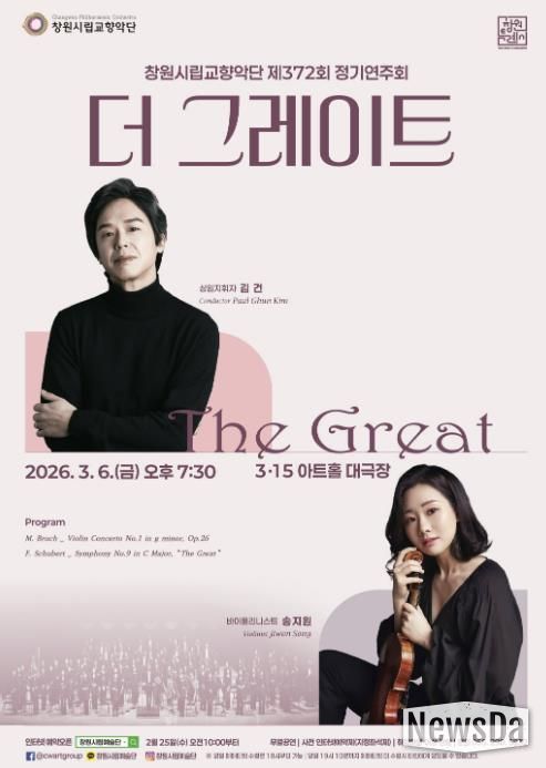 뉴스다 최광묵 기자 | 창원시립교향악단은 오는 2026년 3월 6일 오후 7시 30분, 창원 3.15아트홀 대극장에서 제372회 정기연주회 '더 그레이트(The Great)'를 개최한다.