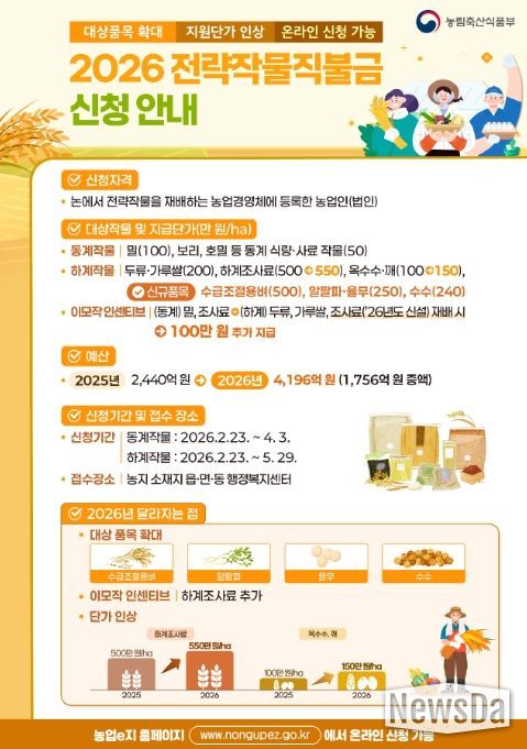 뉴스다 최광묵 기자 | 농림축산식품부는 2026년 전략작물직불금 신청·접수를 2월 23일부터 시작했다고 밝혔다. 전략작물직불금은 식량자급률 제고, 쌀 수급안정 및 논 이용률 항상을 위해 논에 전략작물을 재배·관리하는 농업인에게 지급하는 직불금이다.