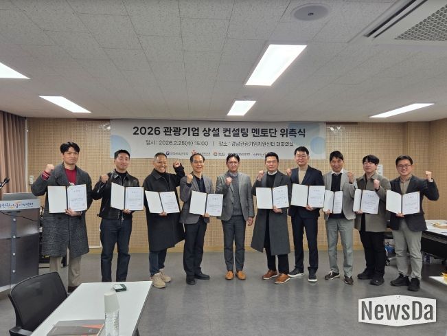 뉴스다 최광묵 기자 | 경상남도는 경남관광재단 관광기업지원센터 주관으로 25일 경남관광기업지원센터에서 ‘2026년 관광기업 상설 컨설팅 멘토단 위촉식’을 개최하고, 도내 관광기업과 예비창업자를 위한 상설 컨설팅 프로그램을 본격 운영한다고 밝혔다.
