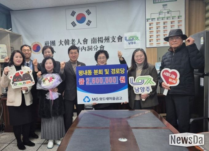 뉴스다 최광묵 기자 | 남양주시는 지난 24일 화도새마을금고(이사장 신기문)가 (사)대한노인회 남양주시지회 평내분회(회장 신영자)에 관내 경로당을 위한 후원금 260만 원을 기탁했다고25일 밝혔다.