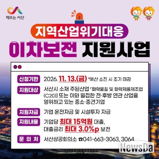 뉴스다 최광묵 기자 | 충남 서산시가 지역 석유화학 관련 기업의 경영 안정을 위해 ‘2026년 지역산업위기대응 이차보전 지원사업’을 본격 추진한다고 밝혔다.