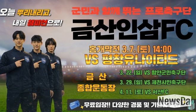 뉴스다 류대현 기자 | 금산의 열정을 대표하는 금산인삼 에프씨(FC)가 3월 7일 오후 2시 금산종합운동장에서 평창 유나이티드를 상대로 시즌 홈 개막전을 개최한다.