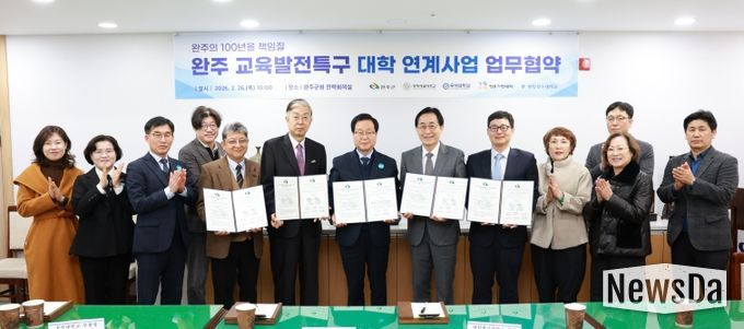 뉴스다 최광묵 기자 | 완주군이 지역의 미래를 책임질 인재를 양성하고 교육 분야의 핵심 동반자 관계를 굳건히 하기 위해 관내 대학들과 손을 잡았다.