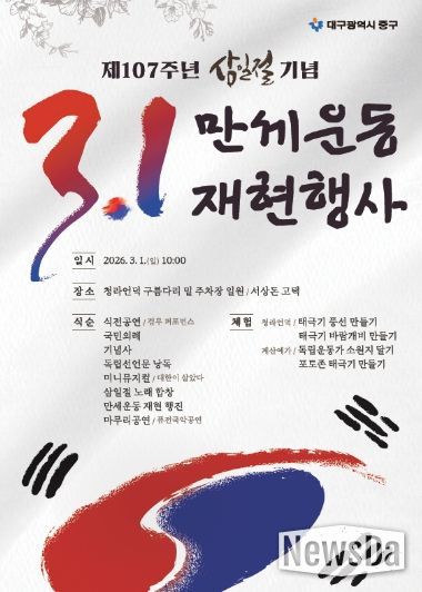 뉴스다 최광묵 기자 | 대구 중구는 제107주년 3.1절을 맞아 오는 3월 1일 오전 10시, 대구 지역 3·1 만세운동의 역사적 현장인 청라언덕과 3.1만세운동길, 이상화·서상돈 고택 일원에서 ‘3.1만세운동 재현행사’를 개최한다.