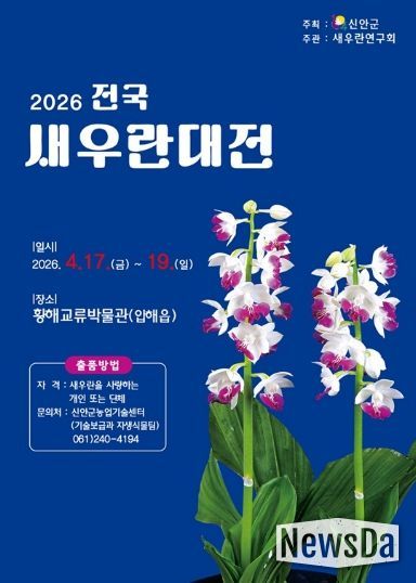 뉴스다 최광묵 기자 | 신안군은 국내 최대 규모의 새우난초 전시·경연 행사인 ‘2026 전국새우란대전’을 4월에 개최하며, 전국의 새우난초 재배 농가, 애호가, 단체를 대상으로 출품 참가자를 모집한다.