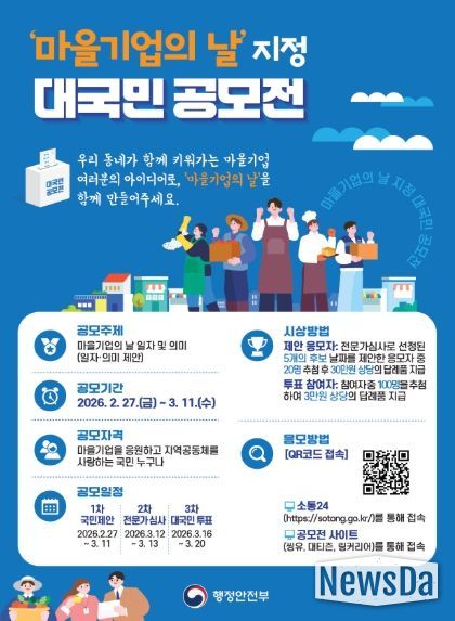 뉴스다 최광묵 기자 | 행정안전부는 ‘마을기업’에 대한 국민의 이해를 높이고 마을기업 활동을 활성화하기 위해 법정기념일인 ‘마을기업의 날’의 날짜와 의미를 국민이 직접 정하는 대국민 공모를 진행한다고 밝혔다.