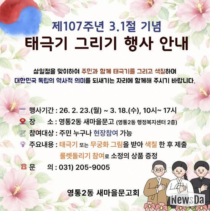 이번 행사는 오는 3월 18일까지 매일 오전 10시부터 오후 5시까지 영통2동 새마을문고에서 진행되며, 전 연령대 누구나 현장 접수를 통해 참여할 수 있다.