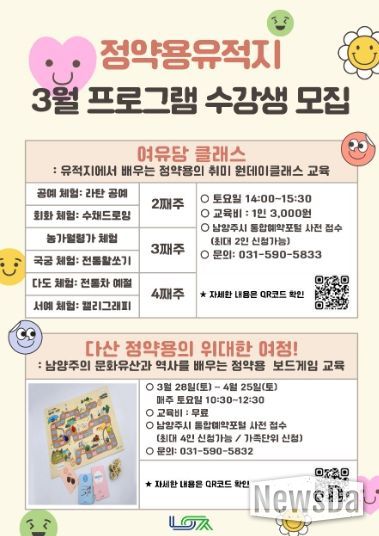한편 이번 3월 프로그램 참여를 희망하는 시민은 남양주시 통합예약포털을 통해 온라인 신청이 가능하다. 자세한 사항은 통합예약포털 내 공지 사항을 확인하거나 남양주시 다산평생학습과로 문의하면 된다.