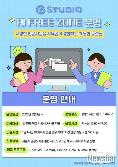 뉴스다 최광묵 기자 | 시흥시중앙도서관은 시민들의 인공지능(AI) 활용 역량 강화를 위해 시 정보통신과와 협업해 도서관 3층 e-스튜디오에 ‘인공지능(AI) 프리 존(Free Zone)’을 구축하고, 오는 3월 3일부터 본격 운영에 들어간다.