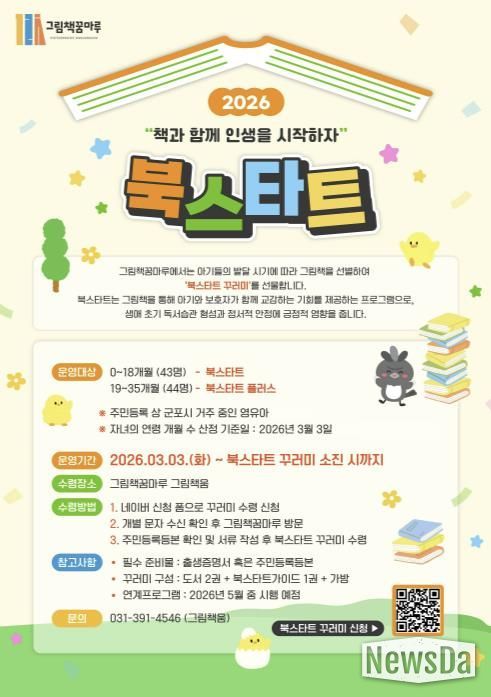 뉴스다 최광묵 기자 | 군포 그림책꿈마루는 영아의 첫 책 경험을 지원하는 ‘북스타트(Bookstart)’ 꾸러미 제공 사업을 진행하기로 하여 2026년 3월부터 신청자 접수를 받는다.
