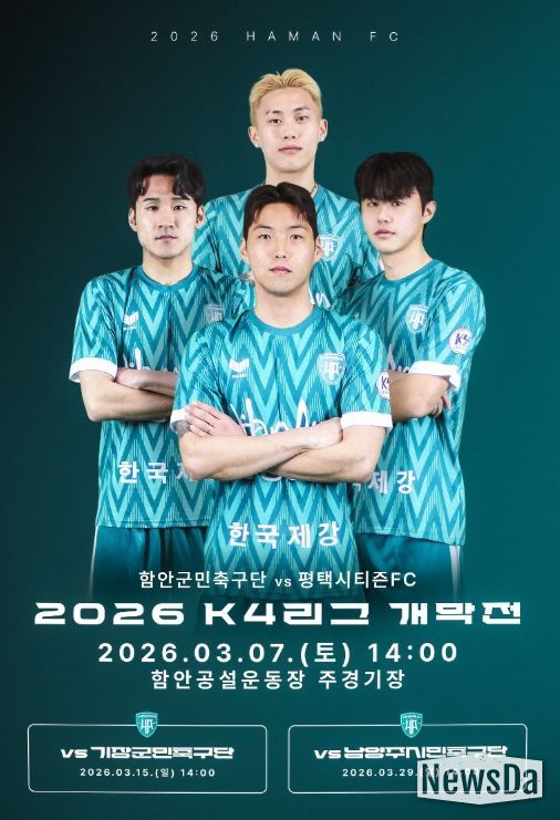 뉴스다 류대현 기자 | 함안군은 오는 3월 7일 오후 2시 함안공설운동장에서 함안을 대표하는 함안군민축구단이 평택시티즌을 상대로 2026시즌 케이포(K4)리그 홈 개막전을 치른다고 1일 밝혔다.