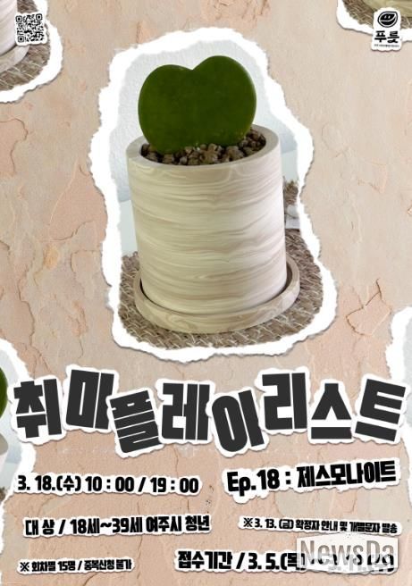 뉴스다 최광묵 기자 | 여주시청년활동지원센터 푸릇은 여주시 청년 문화 활성화 프로그램 ‘취미플레이리스트 Ep.18 제스모나이트’ 참여자를 모집한다고 밝혔다.