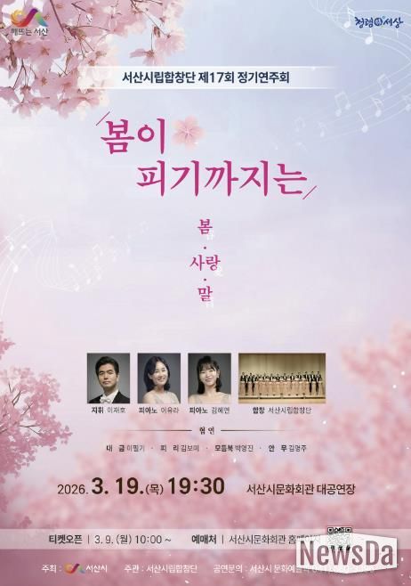 뉴스다 최광묵 기자 | 충남 서산시는 오는 3월 19일 오후 7시 30분 문화회관 대공연장에서 서산시립합창단 제17회 정기연주회 ‘봄이 피기까지는’이 개최된다고 밝혔다.