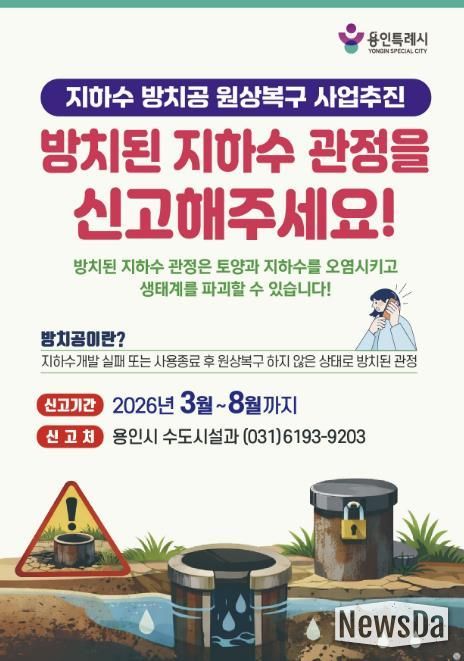 뉴스다 최광묵 기자 | 용인특례시는 장기간 방치된 관정(방치공)으로 인한 지하수 오염을 예방하기 위해 ‘지하수 방치공 원상복구 지원사업’을 추진한다고 5일 밝혔다.