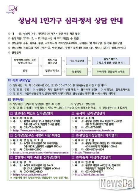 뉴스다 최광묵 기자 | 성남시는 우울감이나 외로움, 불안감, 스트레스로 어려움을 겪는 1인 가구에 전문적인 심리·정서 상담을 지원한다고 5일 밝혔다.