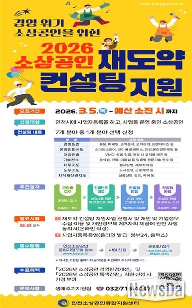 뉴스다 최광묵 기자 | 인천광역시는 오는 3월 5일부터 인천지역 소상공인을 대상으로 경영위기 극복 및 영업 활성화를 위한 소상공인 재도약 컨설팅 지원사업을 본격 추진한다고 밝혔다.