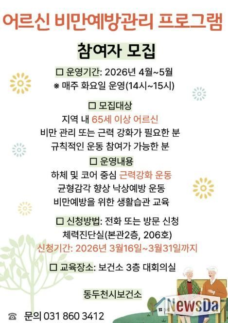 뉴스다 최광묵 기자 | 동두천시 보건소는 오는 4월부터 어르신의 비만 예방과 근력 강화를 통한 낙상사고 예방을 위해 ‘어르신 비만예방관리 사업’을 추진한다.