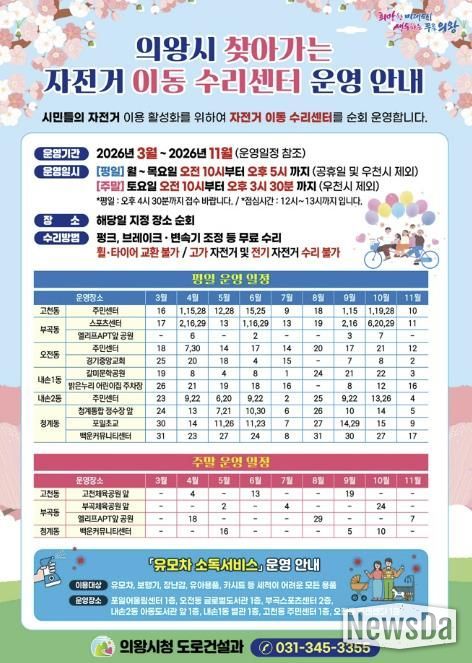 뉴스다 최광묵 기자 | 의왕시가 시민들의 자전거 이용 활성화와 안전한 자전거 문화 확산을 위해 '2026년 찾아가는 자전거 이동 수리센터'를 운영한다.