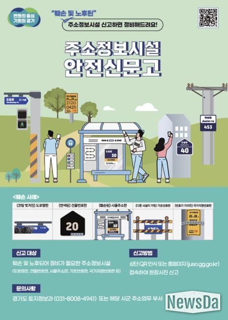 아울러 스마트 주소정보시설에 부착된 QR코드를 통해 산불방지, 찾아가는 정약용 도시대학 등 다양한 시책 및 홍보자료를 제공해 디지털 기반의 생활 밀착형 정보 서비스도 지속 확대한다. 주소정보시설이 훼손되거나 노후해 정비가 필요할 경우 ‘국민신문고’ 및 ‘경기도 주소정보시설 안전신문고’를 통해 신고할 수 있다.