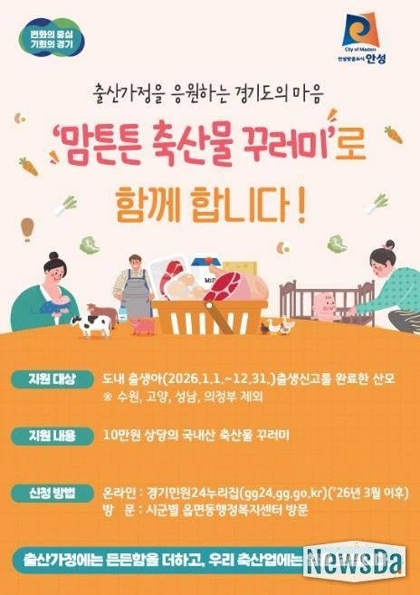 이에 따라 경기도에 주소를 두고 2026년 1월 1일~12월 31일까지 안성시에 자녀 출생신고를 마친 산모에게 1인당 10만 원 상당의 국내산 축산물 꾸러미를 지원한다.