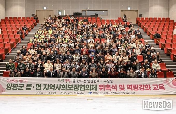 뉴스다 최광묵 기자 | 양평군은 지난 4일 양평도서관 물빛극장에서 250여 명이 참석한 가운데 ‘2026년 제11기 읍면 지역사회보장협의체 위촉식 및 역량 강화 교육’을 개최하고, 지역 맞춤형 복지안전망 강화를 위한 본격적인 활동에 들어갔다고 밝혔다.