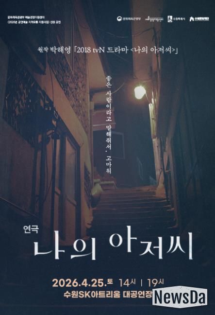 수원문화재단 관계자는 “수원SK아트리움은 전 세대가 공감할 수 있는 우수한 기획 공연을 꾸준히 선보여 왔다”며, “이번 ‘나의 아저씨’에서는 각자의 삶을 돌아보게 하는 따뜻한 이야기를 선보일 예정으로, 가족, 연인, 친구와 함께 공연장에서 봄날의 특별한 시간을 보내시길 바란다”고 전했다.