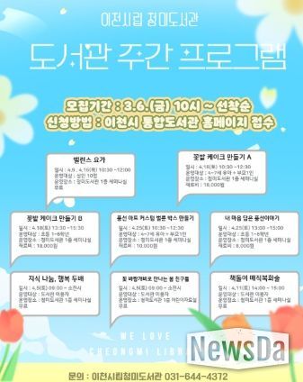 뉴스다 최광묵 기자 | 이천시 청미도서관에서는 오는 4월 1일부터 30일까지 제62회 도서관 주간을 맞아 ‘도서관 속 작은 펼침, 세상을 여는 큰 열림’이라는 주제로 시민들이 즐길 수 있는 체험, 공연, 전시 프로그램을 운영한다.