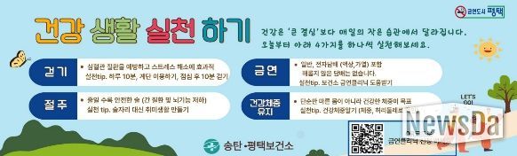 뉴스다 최광묵 기자 | 평택시 송탄보건소는 시민을 대상으로 걷기(신체 활동)·금연·절주·건강 체중 유지로 구성된 ‘4가지 건강생활습관 실천’ 수칙을 안내하며, 일상에서 작은 습관부터 실천해 건강을 지켜나갈 것을 당부했다.