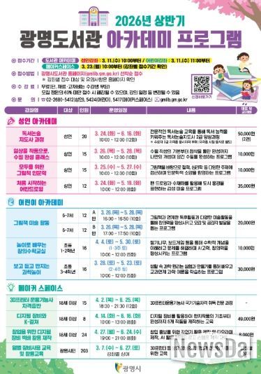 뉴스다 최광묵 기자 | 광명시 광명도서관은 시민의 평생학습 기회 확대와 독서문화 향유 기반 조성을 위해 ‘2026년 상반기 아카데미 프로그램’을 운영한다.