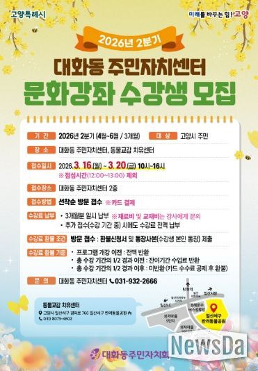 뉴스다 최광묵 기자 | 고양특례시 일산서구 대화동 주민자치회는 주민들의 문화적 욕구를 충족하고 삶의 질을 높이기 위해 오는 3월 16일부터 20일까지 ‘2026년 2분기 문화강좌’ 수강생을 모집한다.