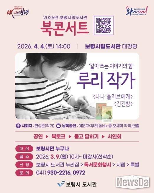 뉴스다 최광묵 기자 | 보령시는 4월 4일 토요일 오후 2시 보령시립도서관 대강당에서 베스트셀러 『긴긴밤』의 저자 루리 작가를 초청해 북콘서트를 개최한다고 밝혔다.