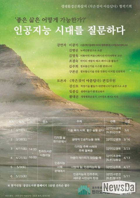 뉴스다 최광묵 기자 | 제주특별자치도 한라도서관은 인공지능(AI)이 일상이 된 시대에 기술과 자연, 인간의 공존 해법을 모색하는 특별 기획 프로그램 '인공지능 시대를 질문하다'를 개최한다.