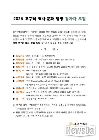 뉴스다 최광묵 기자 | 충주문화원(원장 유진태)이 중국 길림성 집안시와 요녕성 환인시에 위치한 고구려 역사·문화 유적을 탐방할 답사자 18명을 선착순 모집한다.