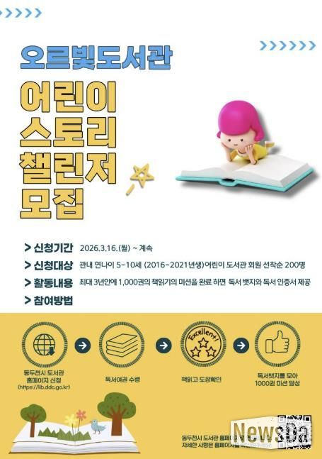 뉴스다 최광묵 기자 | 동두천시 도서문화사업소는 3월 16일부터 관내 5-10세 어린이를 대상으로 ‘어린이 스토리 챌린저’ 참여자를 모집한다고 밝혔다. 이번 사업은 어린이의 자발적인 독서 습관 형성과 ‘책 읽는 동두천’ 분위기 조성 및 독서문화 확산을 위해 마련했다.