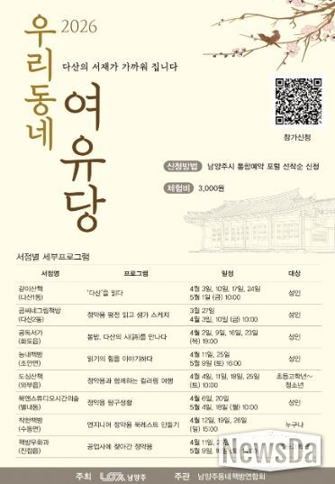 뉴스다 최광묵 기자 | 남양주시는 오는 27일부터 시민이 생활과 밀접한 동네 책방에서 다산 정약용을 접할 수 있도록 ‘우리동네 여유당’ 프로그램을 운영한다고 10일 밝혔다.