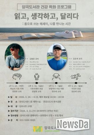 뉴스다 최광묵 기자 | 김포시 양곡도서관은 오는 3월 24일부터 4월 14일까지 시민들의 건강한 여가 생활과 독서 문화 확산을 위한 특화 프로그램 '읽고, 생각하고, 달리다'를 운영한다.