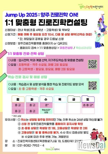 뉴스다 최광묵 기자 | 양주시가 관내 학생들의 체계적인 미래 설계를 돕기 위해 ‘1대1 맞춤형 진로·진학 상담’ 프로그램을 본격 운영한다.
