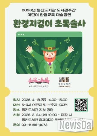 ‘환경지킴이 초록술사’ 공연은 4월 18일 오후 2시부터 3시까지 통진도서관 지하 강당에서 진행된다. 대상은 5~9세 어린이 및 보호자 100명이다. 참여를 원할 경우 3월 24일 오전 10시부터 통진도서관 누리집에서 신청하면 된다.