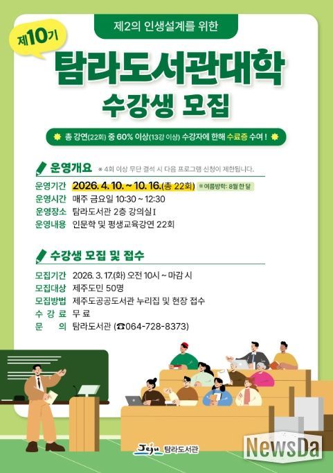 뉴스다 최광묵 기자 | 제주시 탐라도서관은 지역 주민의 평생교육과 삶의 질 향상을 위해 ‘제10기 탐라도서관대학’ 수강생을 3월 17일부터 모집한다.