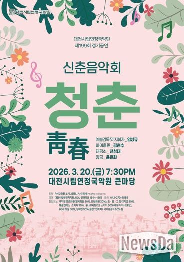 뉴스다 최광묵 기자 | 대전시립연정국악단은 20일 오후 7시 30분, 국악원 큰마당에서 제199회 정기공연 신춘음악회 ‘청춘(靑春)’을 개최한다.