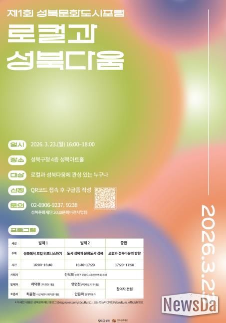 뉴스다 최광묵 기자 | 서울 성북구가 성북구 2030 문화비전 정책사업의 일환으로 오는 3월 23일 제1회 성북 문화도시 포럼 ‘로컬과 성북다움’을 개최한다.